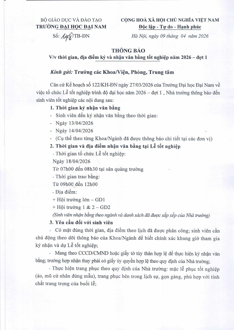 Announcement No. 148/TB-DN dated April 9, 2026, regarding the time and location for signing and receiving graduation certificates for the 2026 academic year – Batch 1.