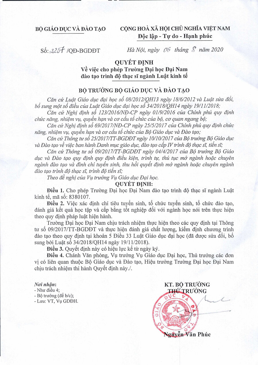 Decision No. 2257/QD-DN dated August 6, 2020, on allowing Dai Nam University to offer a Master's degree in Economic Law.