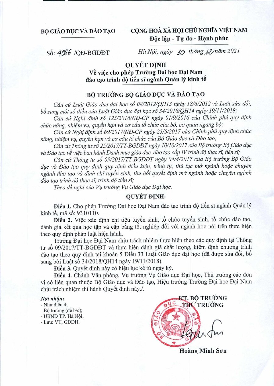 Quyết định số 4966/QĐ-BGDĐT ngày 30/12/2021 về việc làm cho trường Đại học Đại Nam đào tạo trình độ Tiến sĩ chuyên ngành Quản lý kinh tế